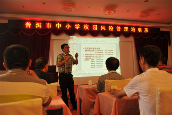 為認(rèn)真貫徹落實(shí)《云南省教育廳關(guān)于舉辦中小學(xué)校園風(fēng)險管理培訓(xùn)班的通知》(云教函[2015]317號)文件精神,進(jìn)一步加強(qiáng)普洱市學(xué)校安全教育和管理工作,切實(shí)提高基層學(xué)校風(fēng)險防控的能力,于2015年8月25日舉辦了義務(wù)教育階段學(xué)校校園風(fēng)險管理培訓(xùn)班。我公司特邀請專業(yè)律師和保險專家,組成培訓(xùn)小組,對參訓(xùn)人員進(jìn)行了培訓(xùn)。專業(yè)律師和保險專家圍繞依法治校、安全管理方法、法律風(fēng)險規(guī)避方法、教育風(fēng)險及風(fēng)險管理辦法、保險法等內(nèi)容展開了詳細(xì)的講解。我公司業(yè)務(wù)總監(jiān)羅琳對2014學(xué)年受理的校方責(zé)任保險案例作了詳盡的分析,并提出了相關(guān)風(fēng)險管理建議。她指出,我省校園安全責(zé)任事故類型主要以意外傷害事故為主,因此加強(qiáng)安全與防范教育以及校園課間管理尤為重要。客服部鄧曉麗詳細(xì)解釋了《云南省教育廳等四部門關(guān)于加強(qiáng)學(xué)校保險工作的指導(dǎo)意見》(云教體[2014]26號)中所列的險種,并提出了相關(guān)建議。