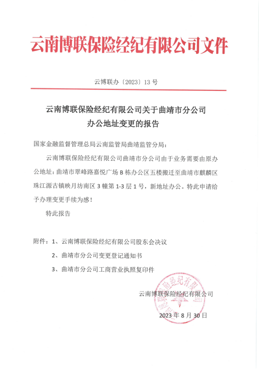 云南博聯(lián)保險經(jīng)紀(jì)有限公司關(guān)于曲靖市分公司辦公地址變更的報告