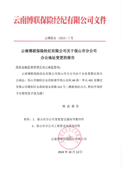 云南博聯(lián)保險(xiǎn)經(jīng)紀(jì)有限公司關(guān)于保山市分公司辦公地址變更的報(bào)告